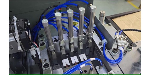 •新型(xíng)衝切係統:全新設計的衝切組合,可同(tóng)時安裝多種不同規(guī)格的模具,軟件自(zì)動選擇模具衝切